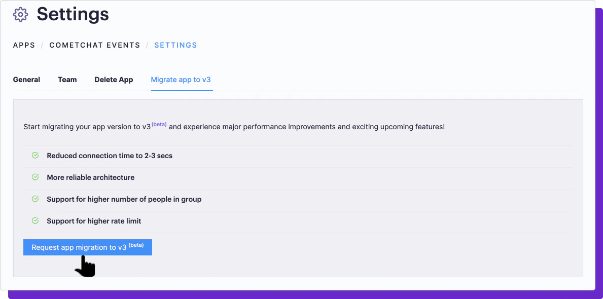 - In Settings, select Migrate App to v3 tab. Then, click on the “Request app migration to v3” button as shown below. Once your request is sent, our team will get in touch with you and manually transition the app to a “migrating” status.