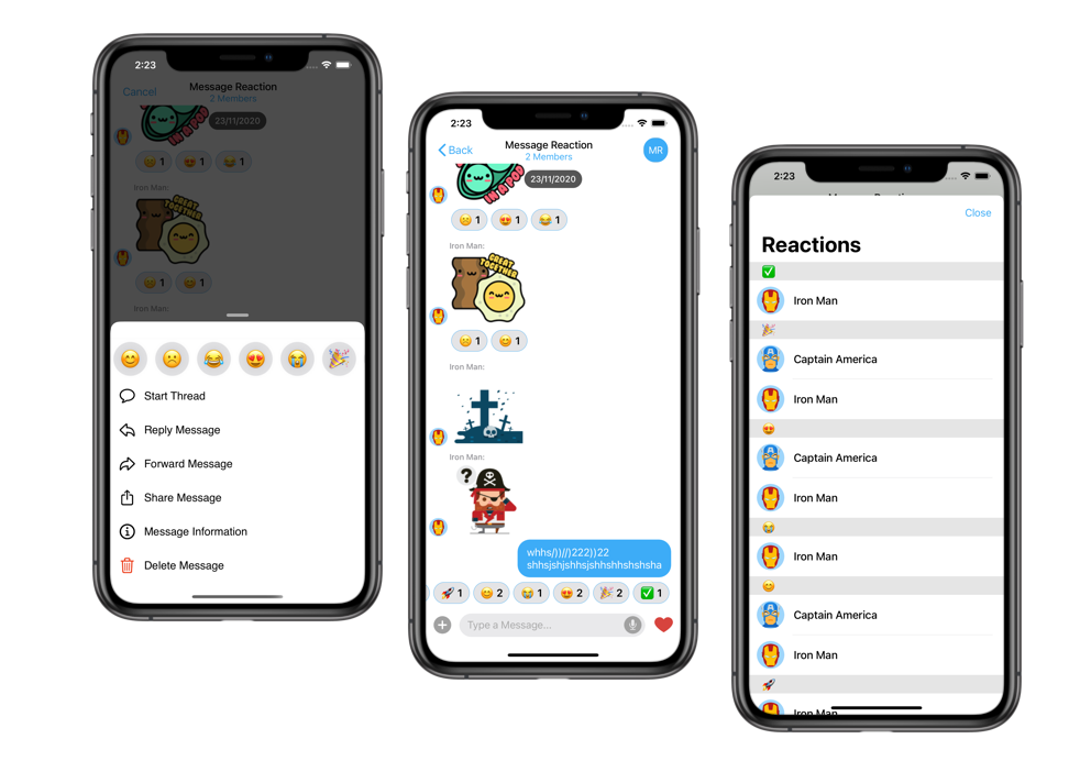 A user can react to a message using multiple emojis. To allow a user to react to a message, show a popup with all the available emojis. Once the user clicks on a particular emoji, add that emoji as a reaction to the target message. If a user has reacted to a message using a certain emoji and clicks on the same emoji, remove it from the target message. Sending Reactions To add a reaction using selected emoji, use thecallExtension method provided by our SDKs as follows: