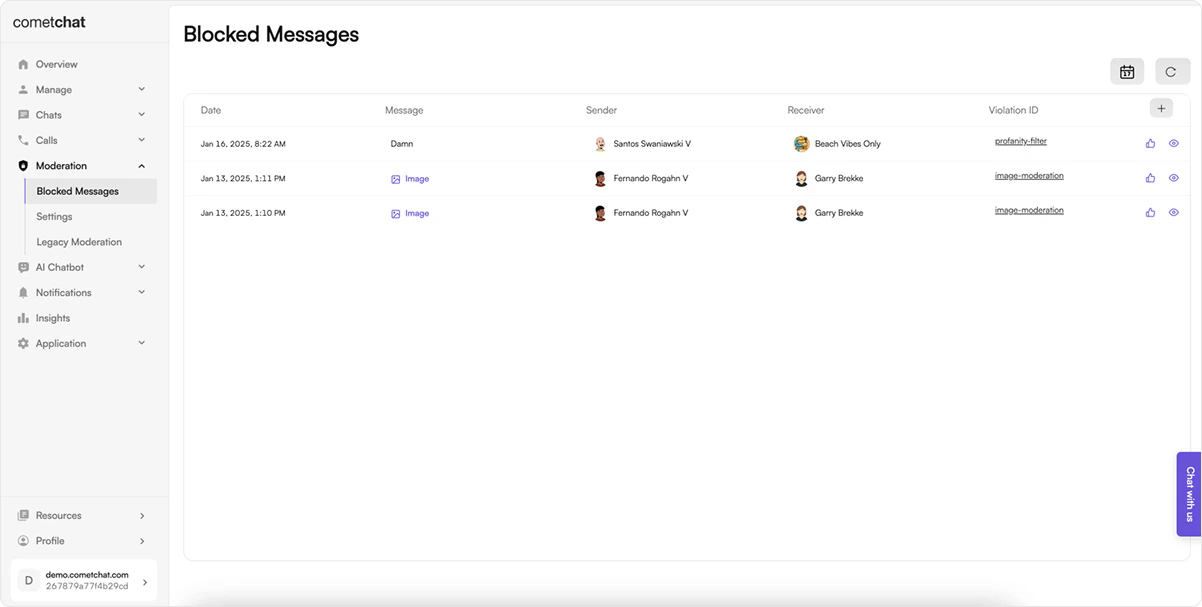 The Blocked Messages endpoint in the Moderation Service API provides app owners and collaborators with the capability to retrieve details about messages that have been blocked due to violations of message moderation rules. This endpoint plays a crucial role in enabling platform app owners and collaborators to review and manage content that has been deemed inappropriate, harmful, or non-compliant with platform guidelines.List Blocked Messages