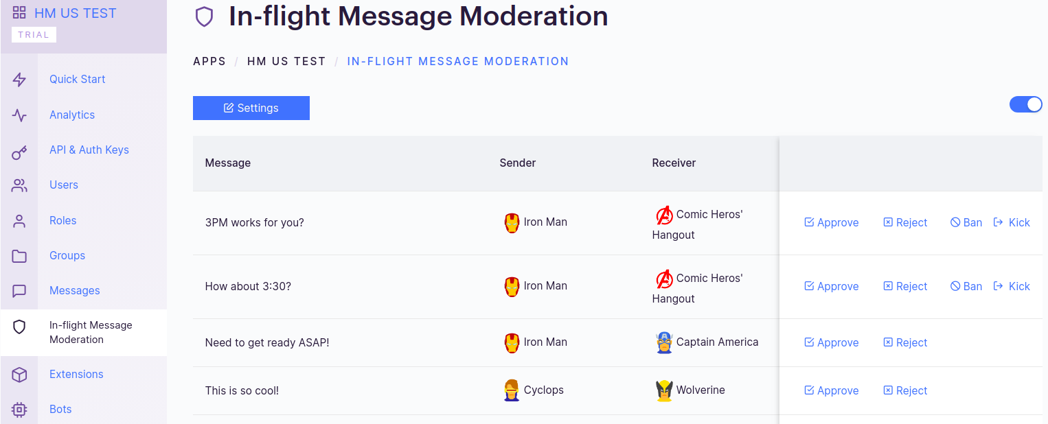 Once the extension is enabled and the settings are saved, navigate to the In-flight Message Moderation section of the Dashboard to manually moderate messages: