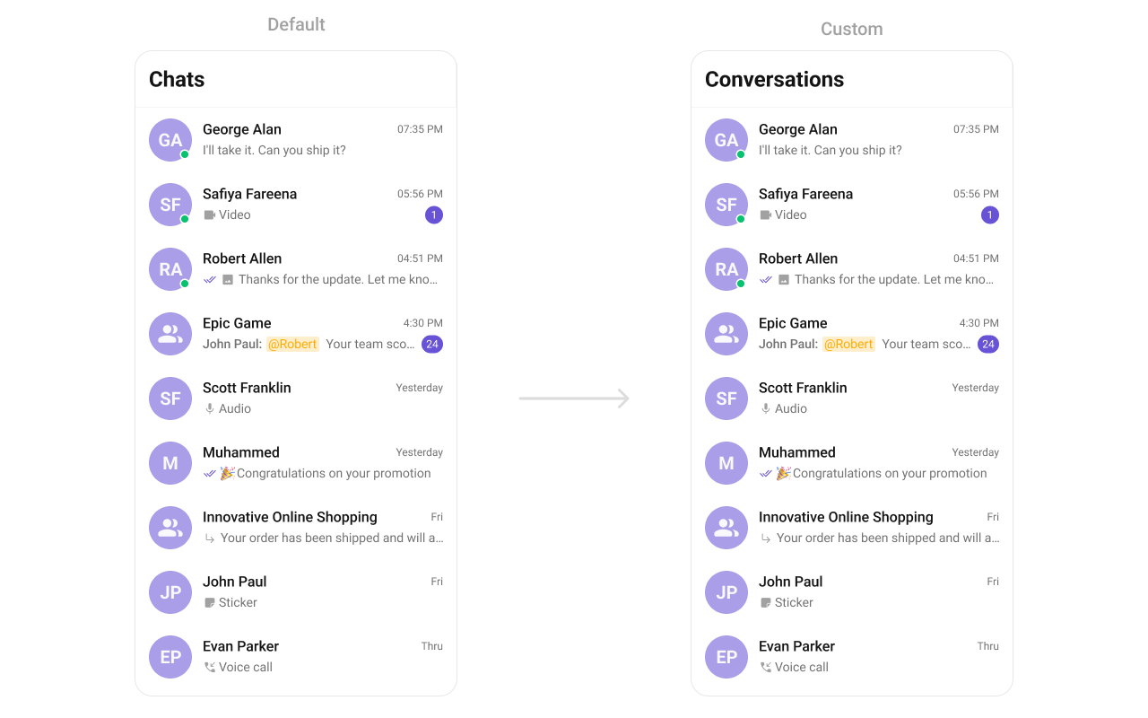 This string is used in the CometChatConversations component to label the chat list. Customizing the String To change this text to “Conversations”, add the following line in your app’s res/values/strings.xml file: