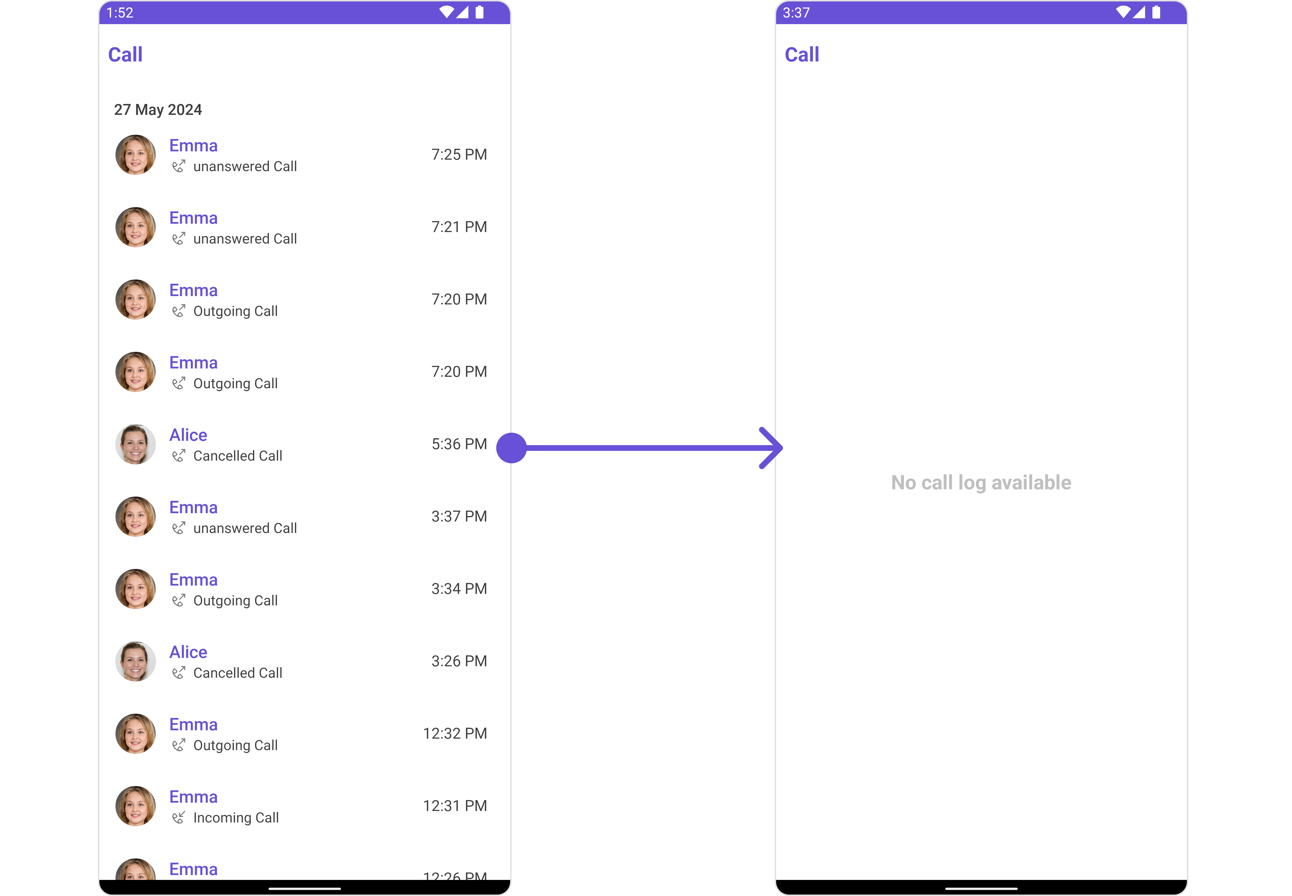 You can integrate CometChatCallLogs into your Activity and Fragment by adding the following code snippets into the respective classes.