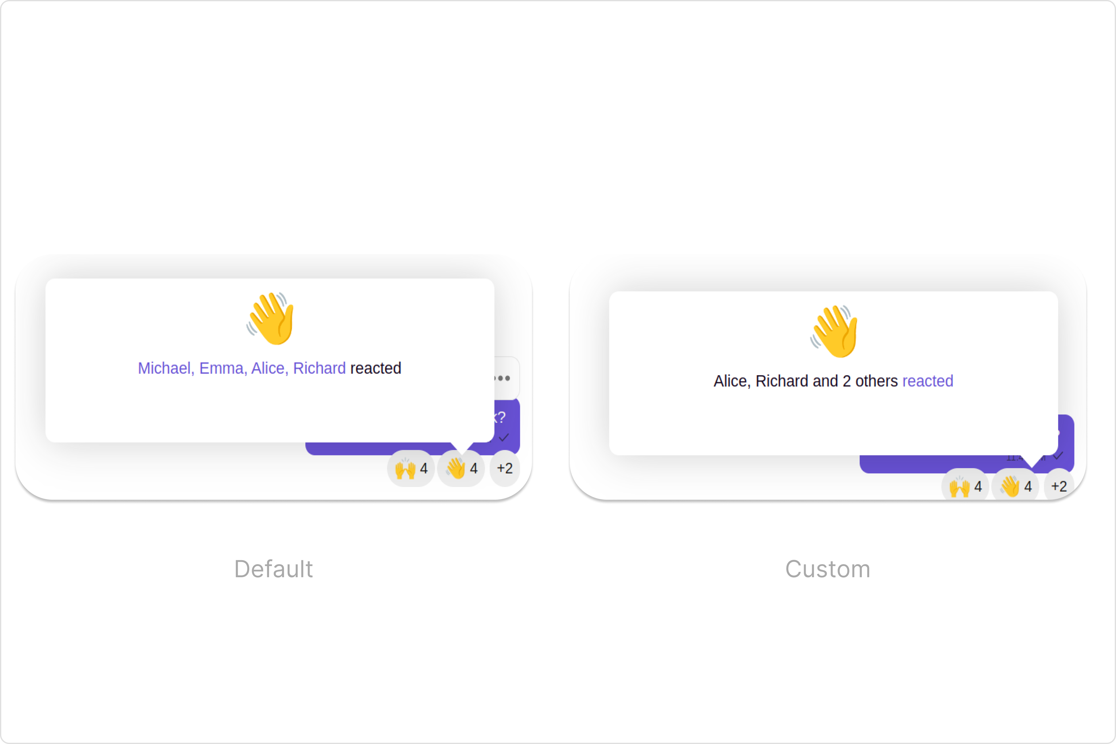 To fit your app’s design requirements, you can customize the appearance of the Reaction Info component. We provide exposed methods that allow you to modify the experience and behavior according to your specific needs.Style