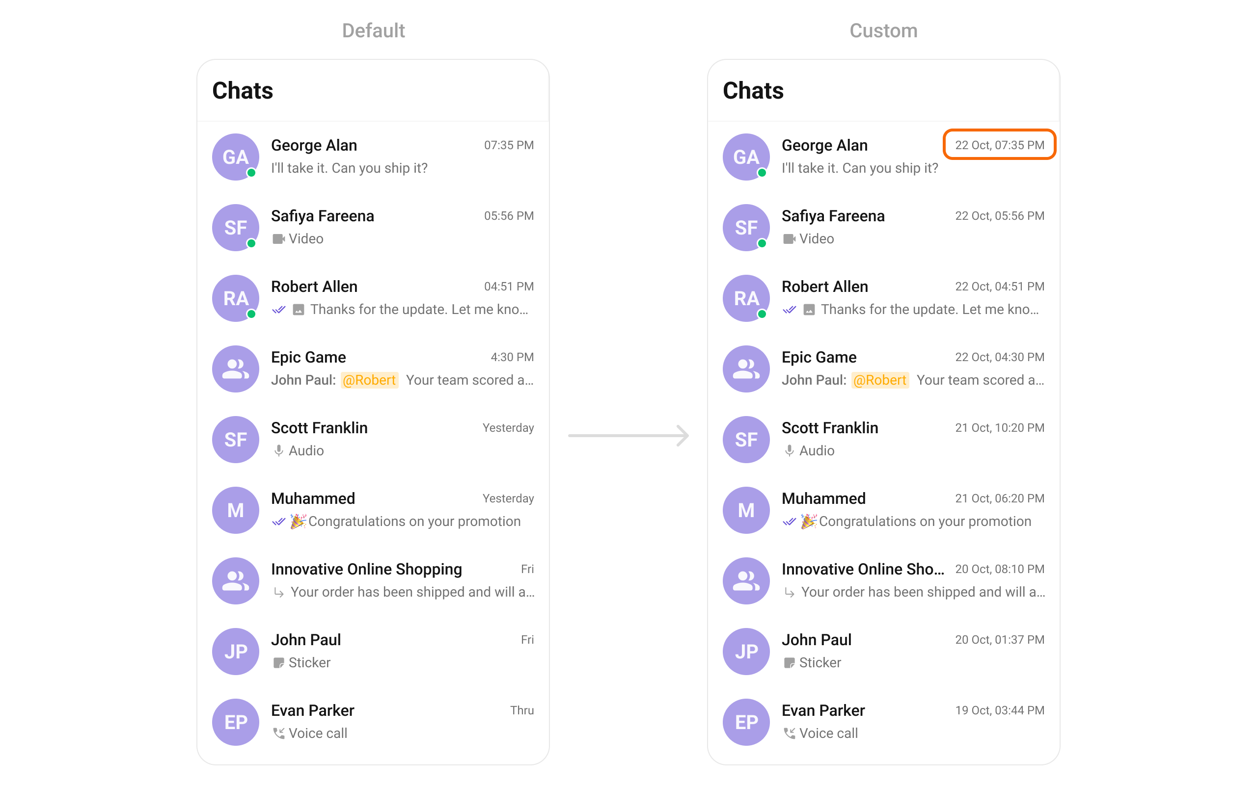 | Date Pattern | Used to display a custom string instead of the timestamp show at the tail of the conversation item | datePattern: String Function(Conversation conversation) |