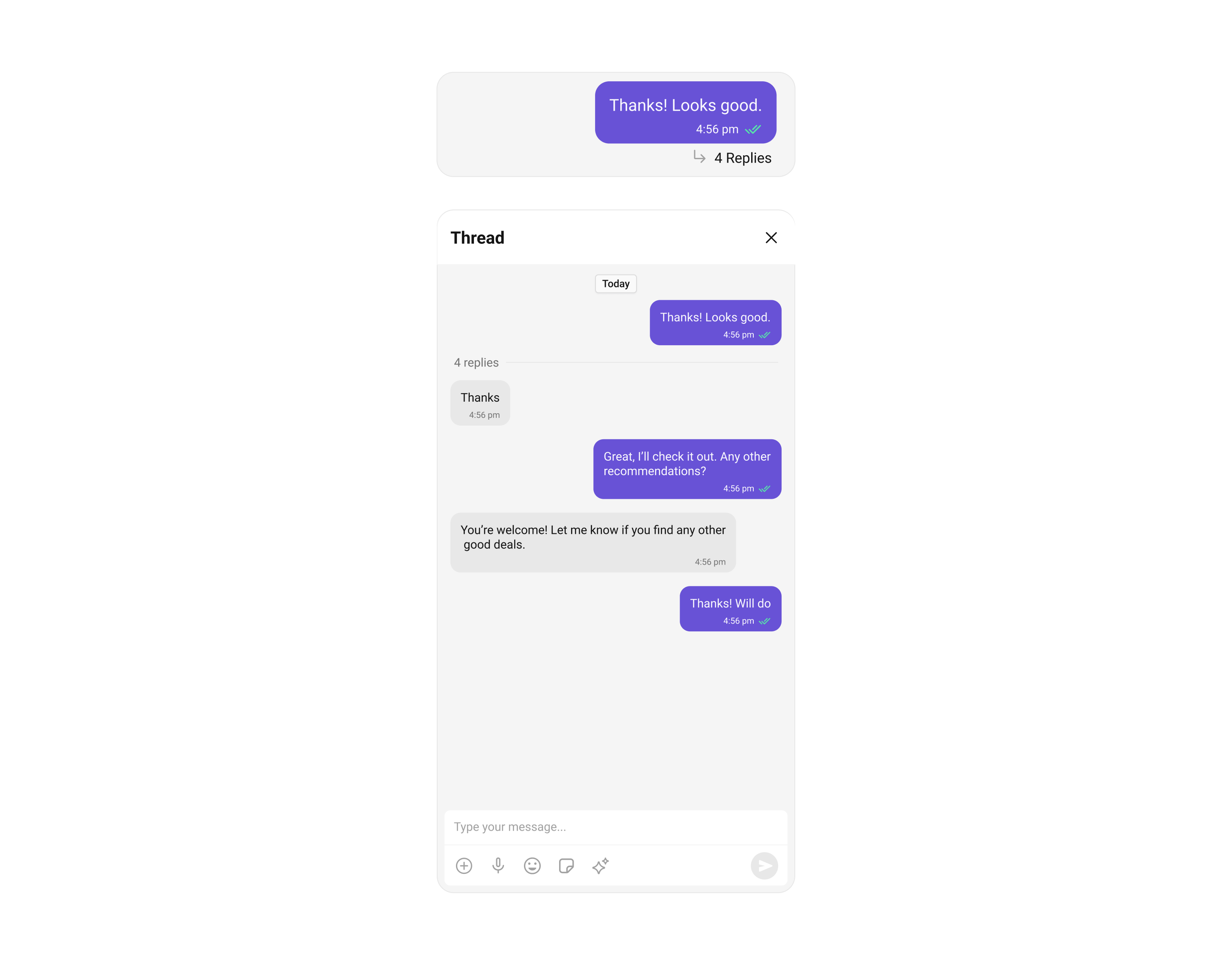 | Threaded Messages | Threaded Messages that displays all replies made to a particular message in a conversation. |