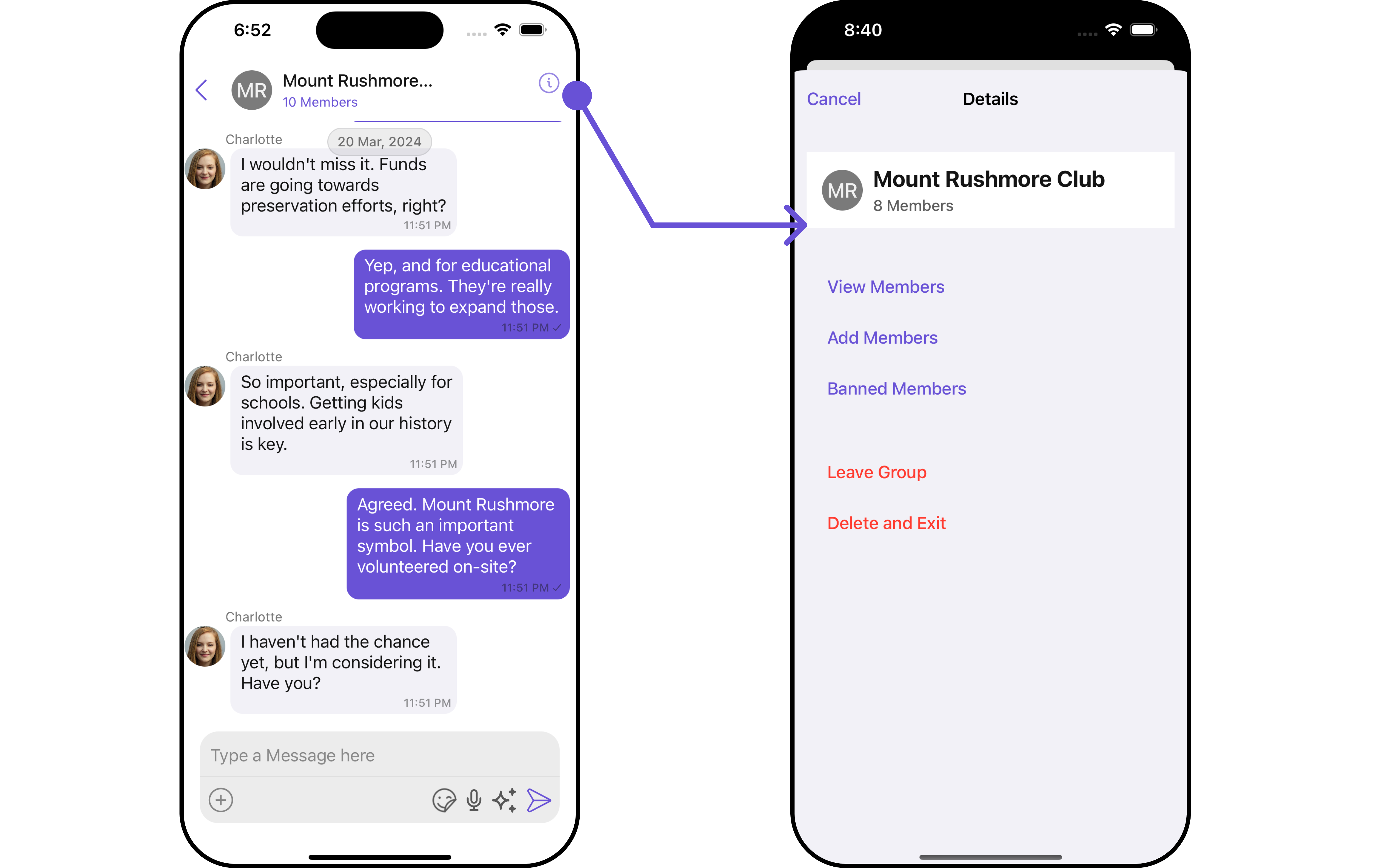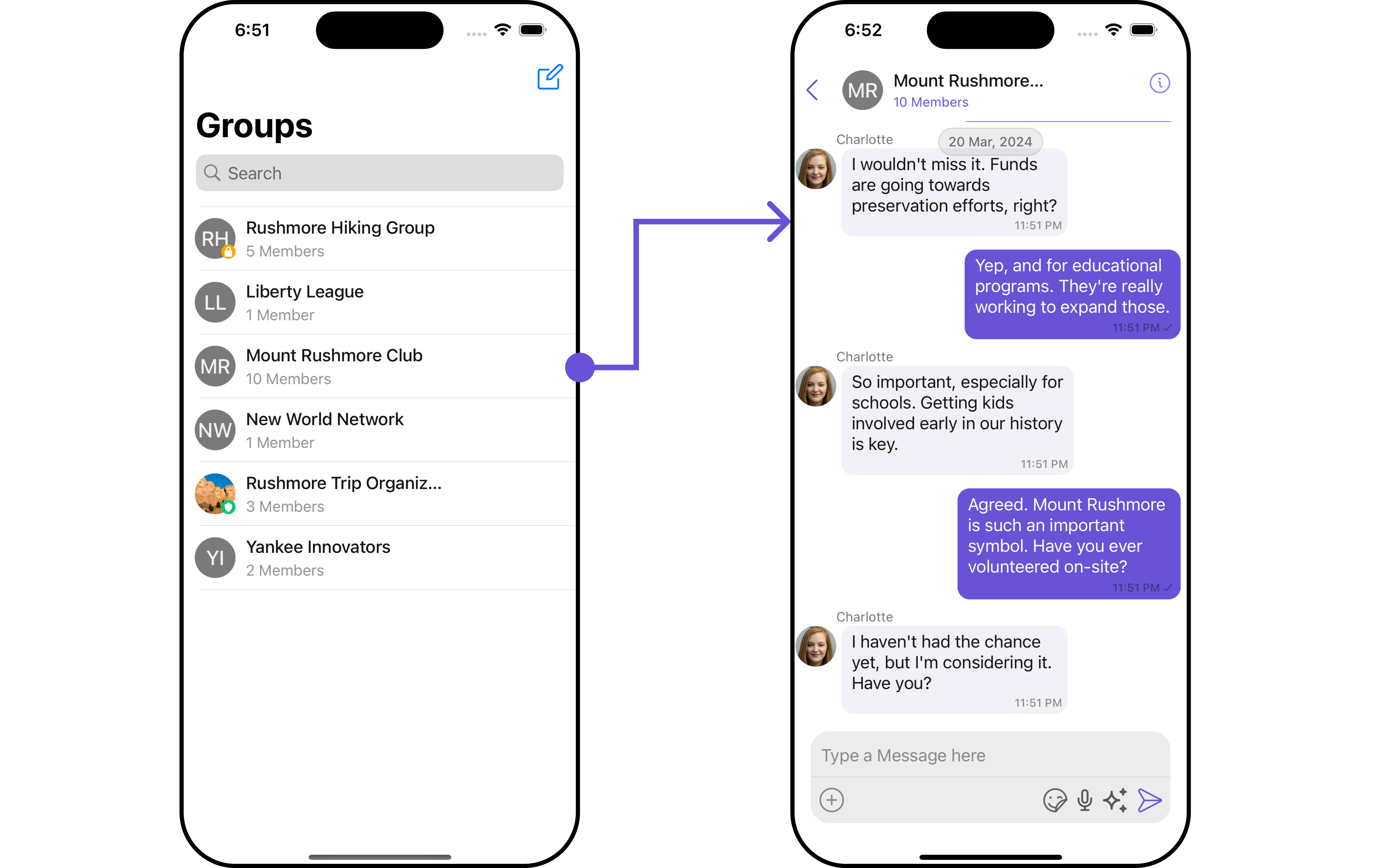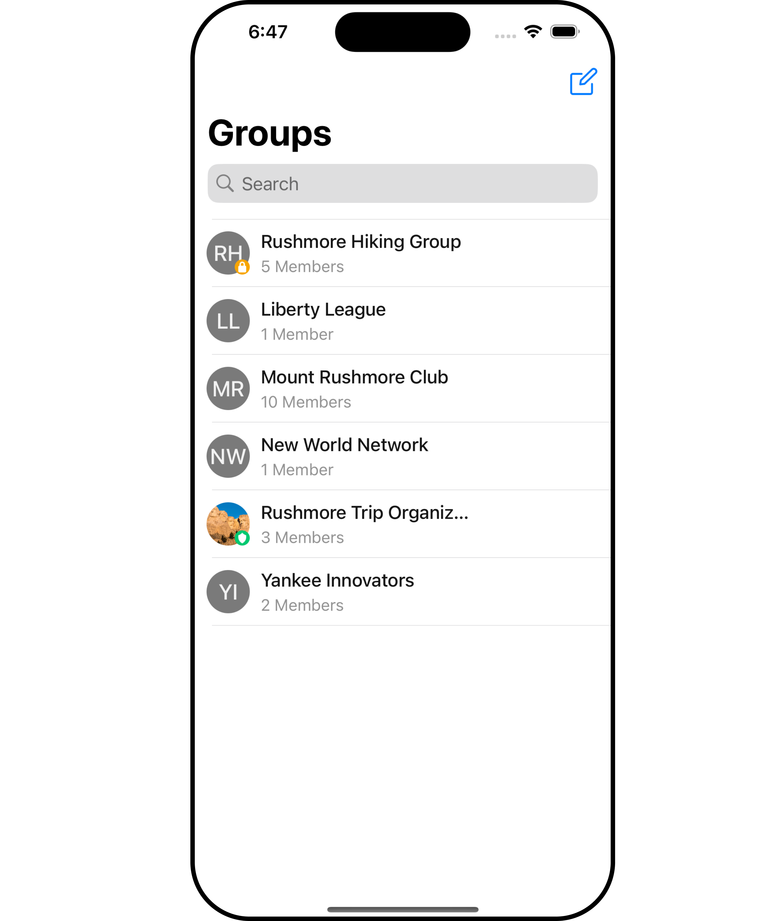 AsGroupsWithMessages is a view controller, it can be effortlessly added directly in response to a button click or any event. Leveraging all the customizable properties and methods inherited from Groups, this component offers seamless integration and extensive customization capabilities. This makes it a versatile solution for enhancing user interaction within your application.