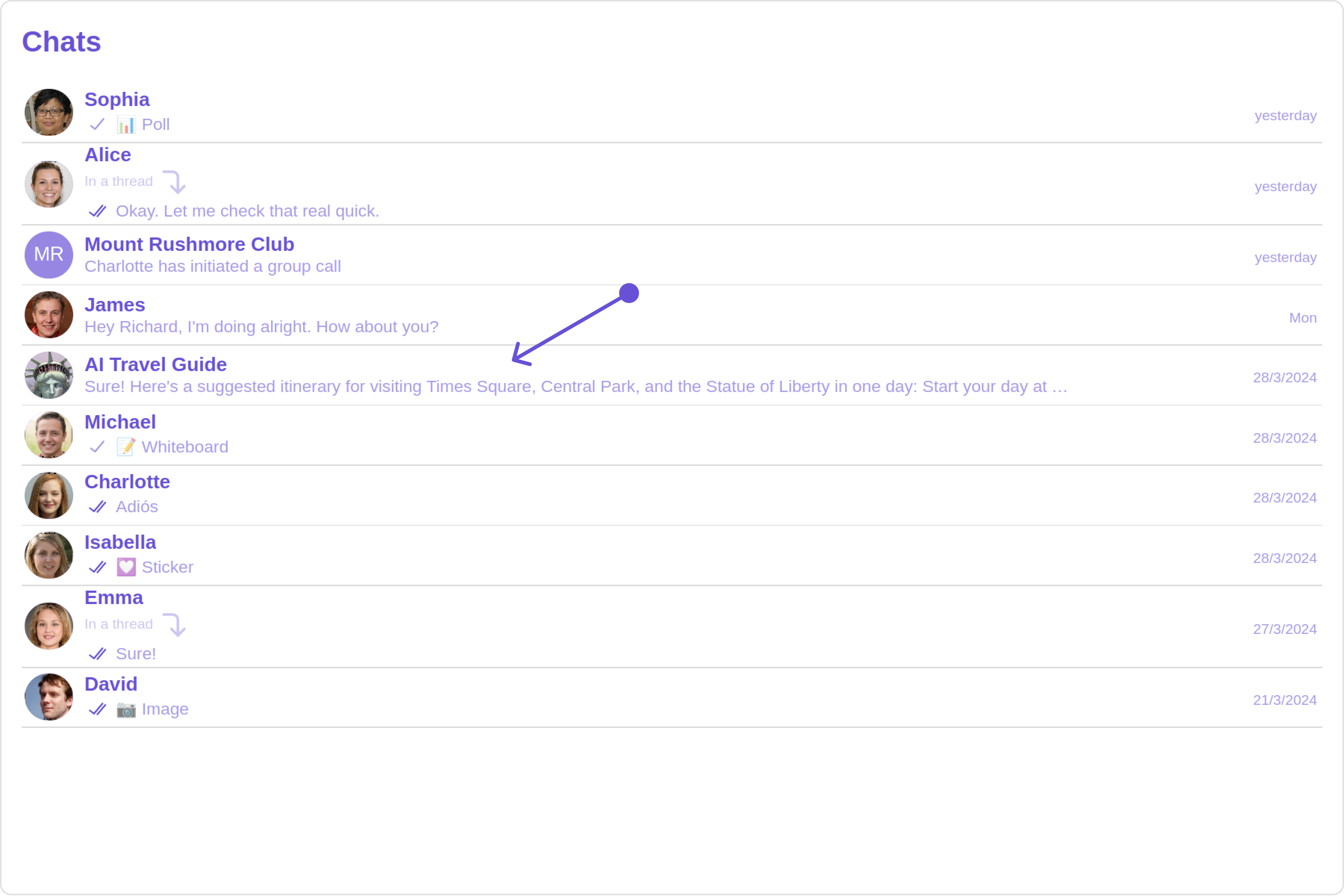 OnItemClick is triggered when you click on a ListItem of the Conversations component. The OnItemClick action doesn’t have a predefined behavior. You can override this action using the following code snippet.